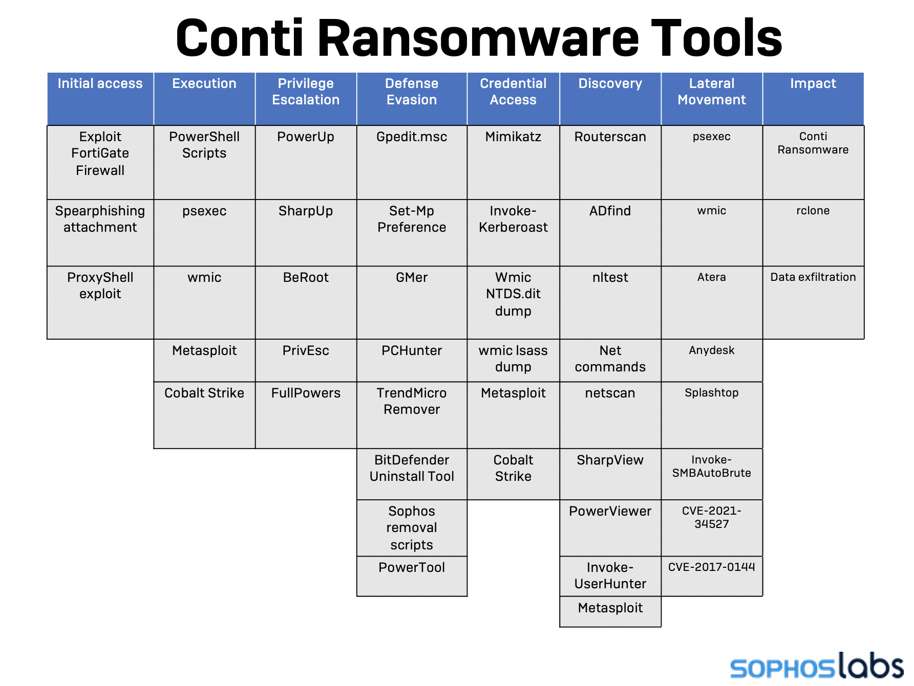 En las 48 horas posteriores a la obtención de ese acceso inicial, los atacantes habían exfiltrado aproximadamente 1 Terabyte de datos. Después de cinco días, implementaron el ransomware Conti en cada máquina de la red, apuntando específicamente a los recursos compartidos de red individuales en cada ordenador. Durante el transcurso de la intrusión, los afiliados de Conti instalaron no menos de siete puertas traseras en la red: dos web shells, Cobalt Strike y cuatro herramientas comerciales de acceso remoto (AnyDesk, Atera, Splashtop y Remote Utilities). Los web shells, instalados desde el principio, se utilizaron principalmente para el acceso inicial; Cobalt Strike y AnyDesk fueron las herramientas principales que utilizaron durante el resto del ataque.