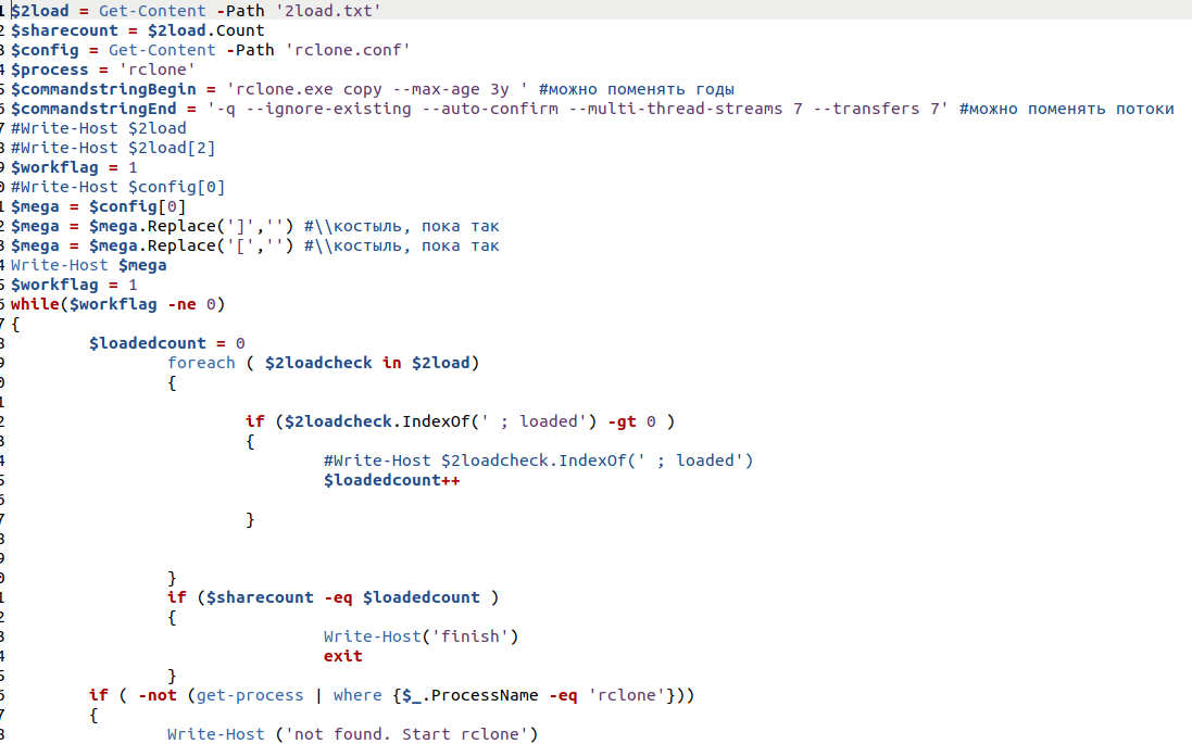 Este script lee de un par de archivos que incluyen las direcciones de unidades remotas para copiar al servicio de intercambio de archivos Mega, y el nombre de usuario y contraseña de esa cuenta. Se vio tráfico durante dos días yendo a Mega desde los servidores en los que se instaló Rclone, con poco menos de 1 TB de datos exfiltrados.