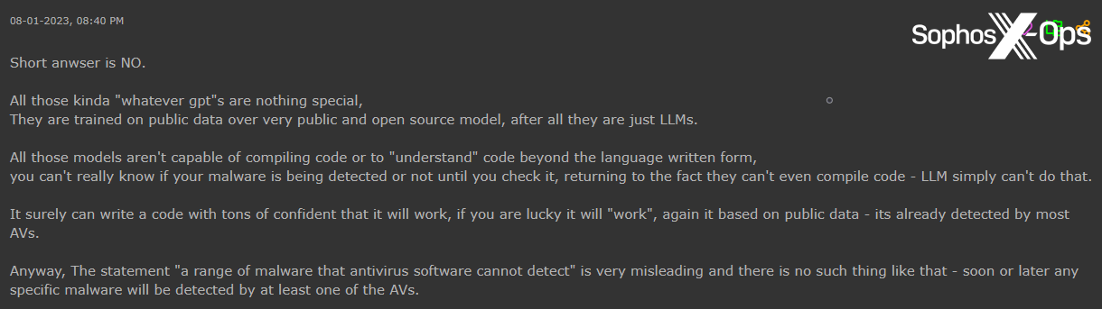 同じ批判は FraudGPT にも浴びせられており、他のユーザーもその能力を疑問視しています。たとえば、ある Hackforums のユーザーは、FraudGPT が「ウイルス対策ソフトウェアが検出できないマルウェア群」を生成できるという主張が正しいかどうかを尋ねました。そのユーザーに対して、別のユーザーが詳しい見解を提供しました。