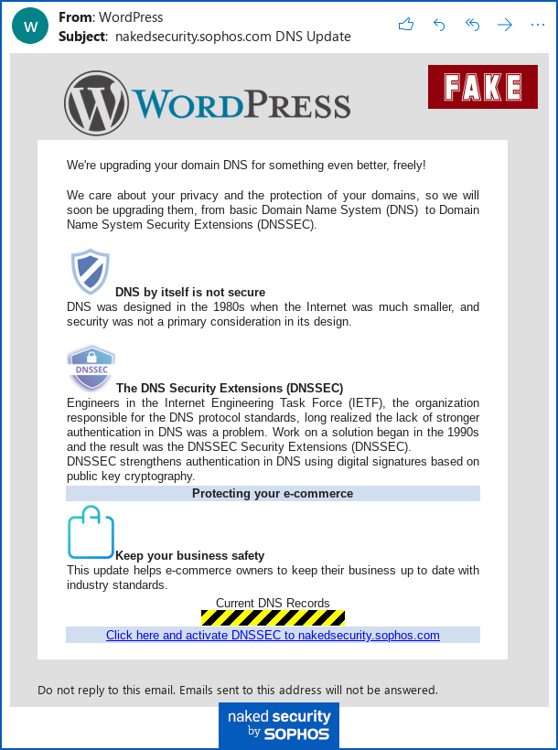 This scam pretended to come from WordPress itself, and claimed that DNS security features would soon be added for our domain: