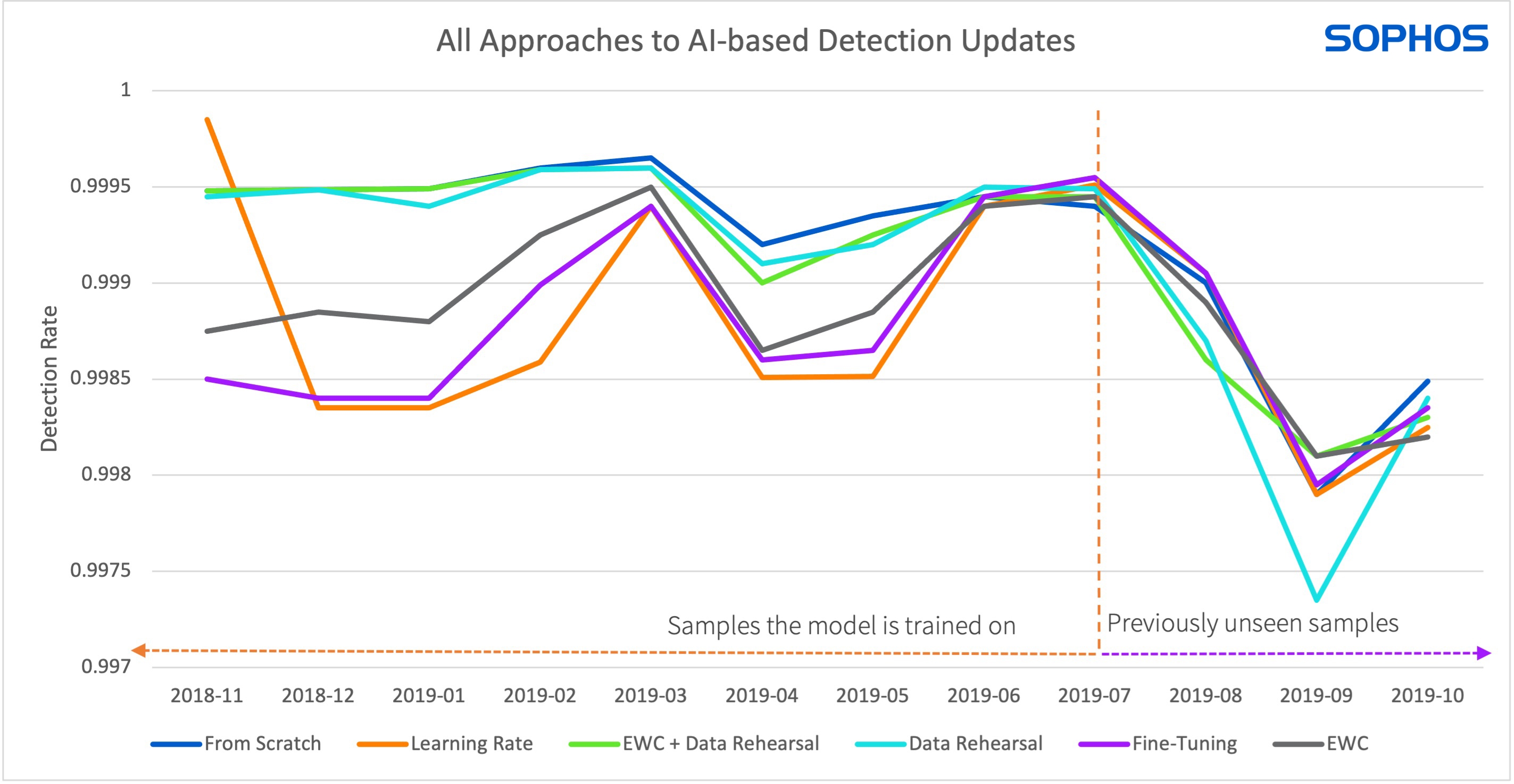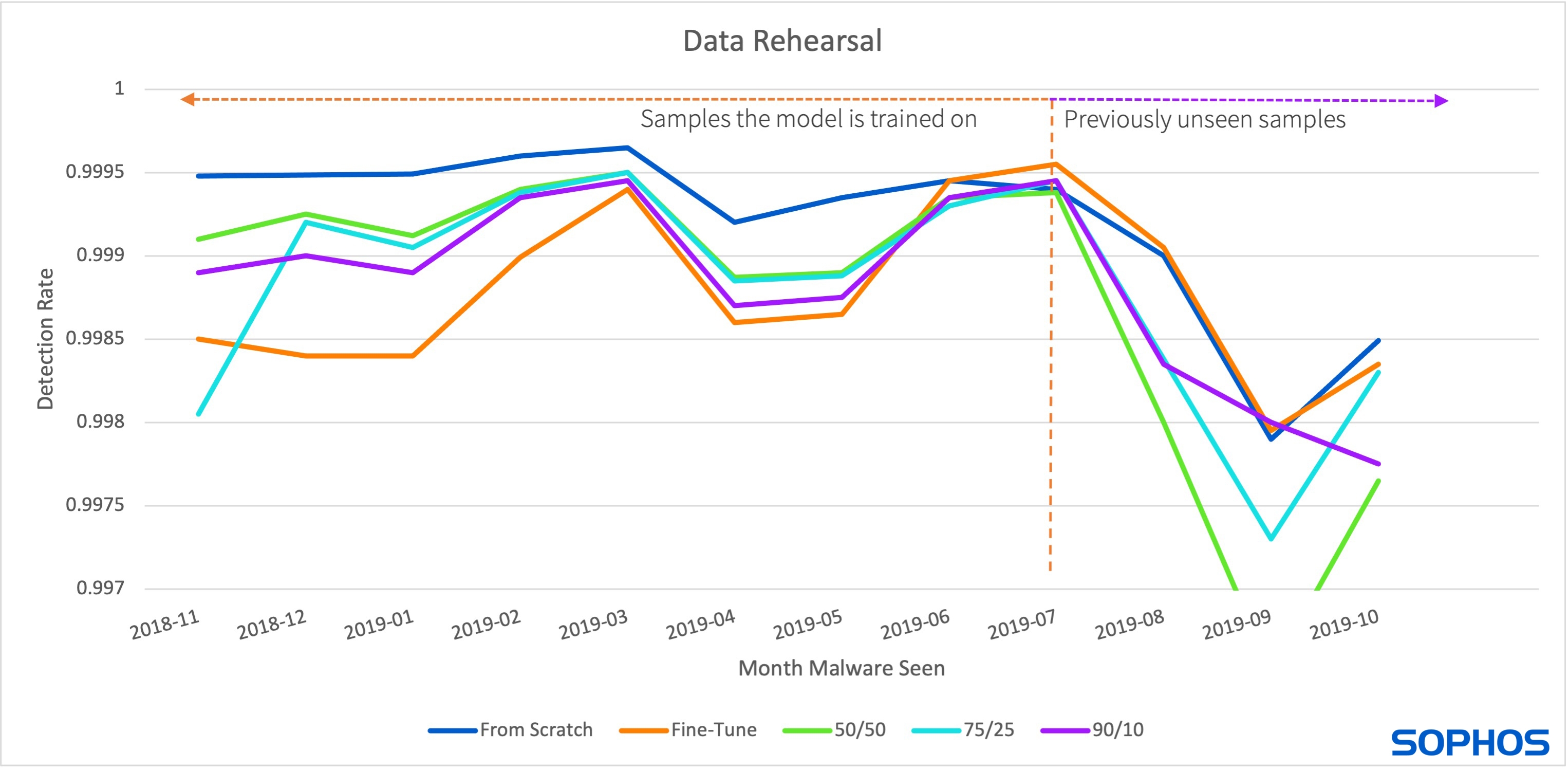 When comparing all three approaches, it is important to consider the trade-offs between (1) performance, (2) computation costs, and (3) data maintenance costs. Elastic weight consolidation and changing the learning rate do not require older samples, but they are not the highest performers either. Meanwhile, data-rehearsal has stronger comparative performance to a model trained from scratch on both old and new data. It also reduces the overall cost of computation and data storage. Sanders’ evaluation concluded that data rehearsal was the most effective for Sophos in terms of detection rate and cost.