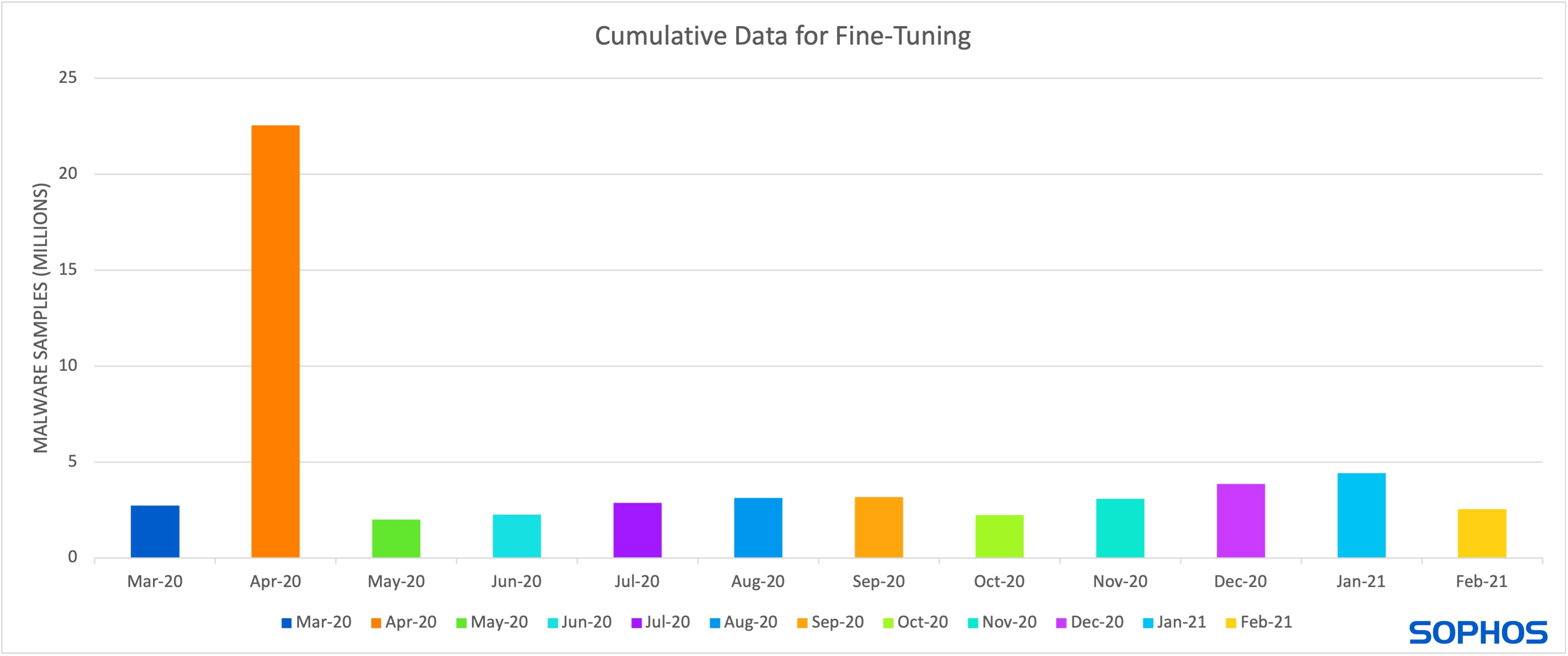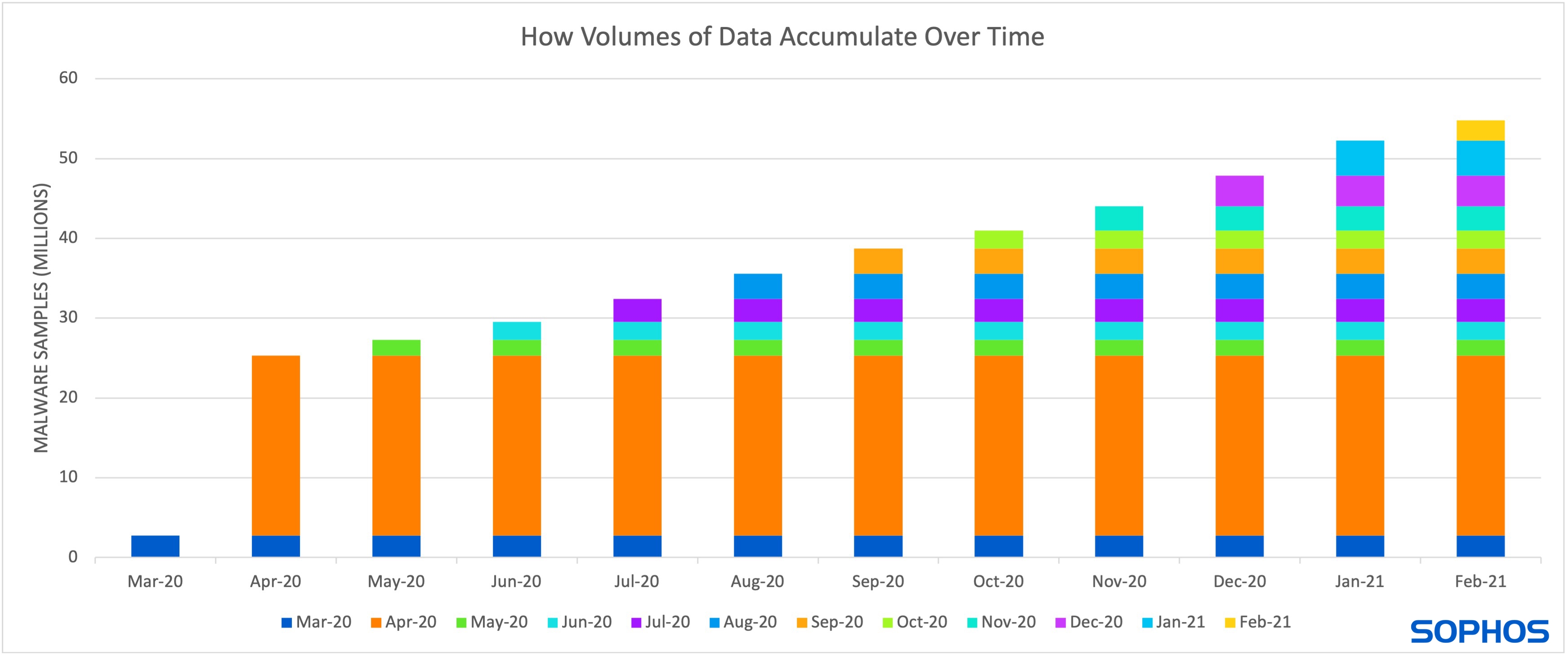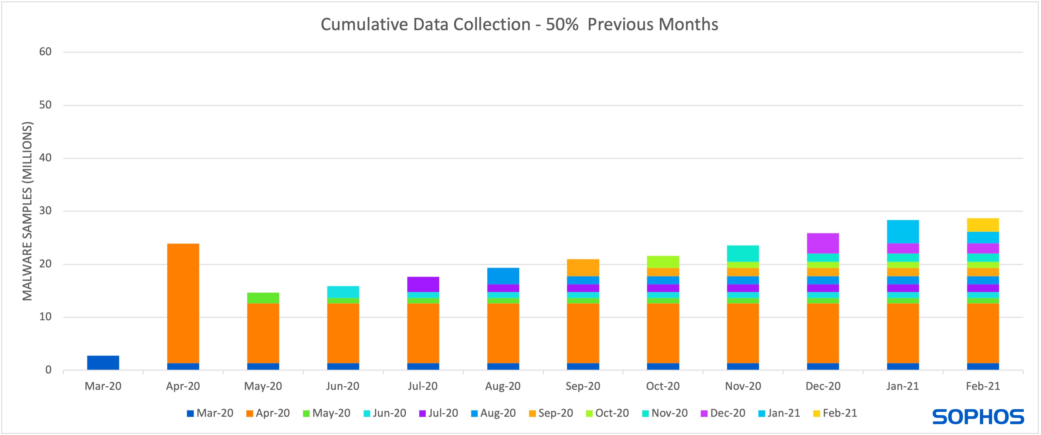 Figure 2. This figure shows the increase in data storage if vendors collect 25% of malware released each month, starting in March, in order to train a model from scratch. The number of samples released per month are provided by AVTest.
