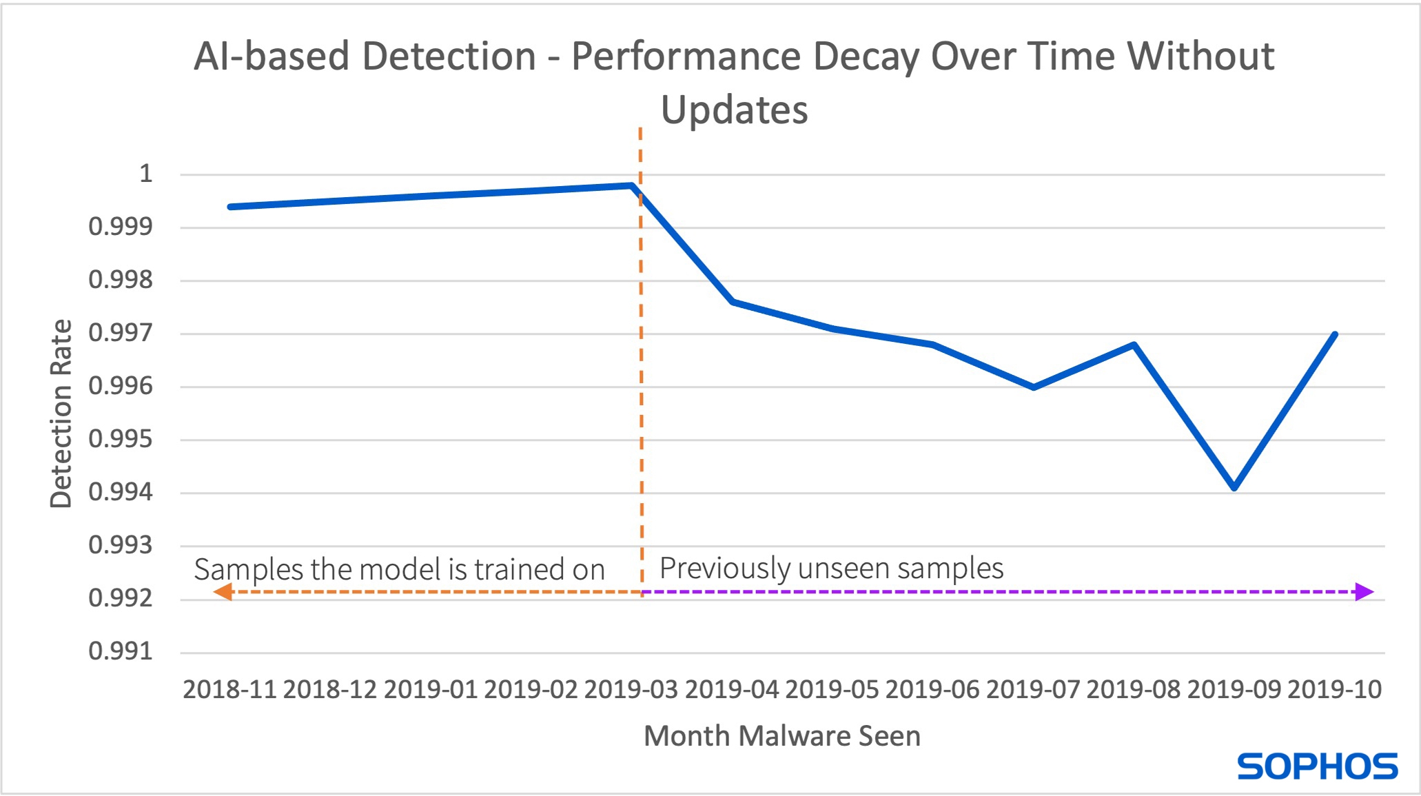AI provides security vendors a better chance of keeping up with the “something new” but must be updated constantly to avoid a significant performance dip when new malware changes the threat landscape (as shown in Figure 1).