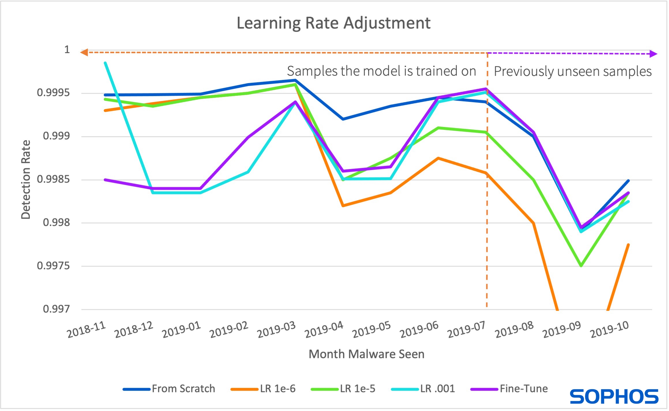 The second approach modifies how quickly the model learns by adjusting the learning rate – the amount that a model can change after seeing any given sample. Too high a learning rate, and the model will only “remember” the most recent samples that it has seen; too small a learning rate and it takes too long to learn anything at all. But, by limiting the learning rate, the model does not change drastically from its original form, allowing some remembering of previously learned patterns from older data. However, this also limits the learning of new patterns, hurting detection rates on new malware.