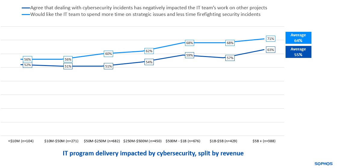 The time and effort needed to deal with cybersecurity results in reduced capacity for IT program delivery, with 55% of respondents reporting that dealing with cyberthreats has negatively impacted the IT team’s work on other projects. Furthermore, the urgent and unpredictable nature of cybersecurity also gets in the way of business-focused efforts: 64% wish the IT team could spend more time on strategic issues and less time on firefighting.