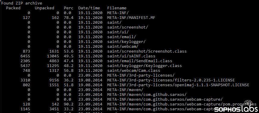 In another instance, we found a malicious installer of a modified version of Minecraft. The installer actually does deliver a full version of the ubiquitous creative block-building game, but with a twist. Disguised as a “mod” with special features called Saint, the Minecraft installer bundled a Java application that was capable of capturing keystrokes and screenshots from the target’s system, as well as images from the camera on the infected computer. The Java classes inside the file are an unmistakable indication of the malware’s capabilities.
