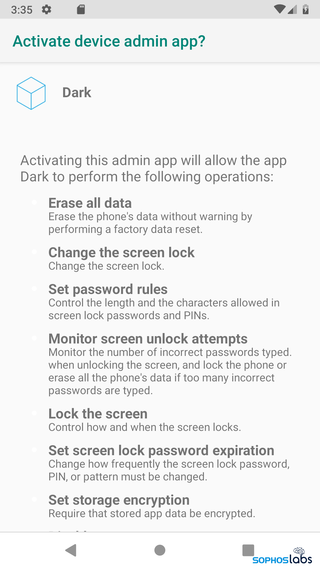 The Android malware files were given names and icons that could lead someone to believe they are legitimate banking or game updater apps. One of the apps appeared to use the icon and name of a COVID-19 contact tracing app. Several generated popups within the device that demanded that the user activate them as a “device admin,” which gives the apps near-total control over the device.