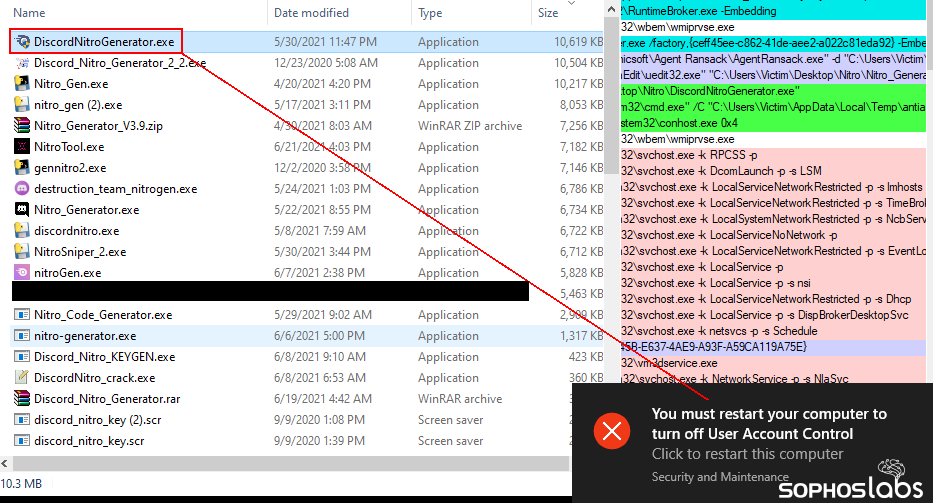 The same “nitrogen” utility’s batch script disabled a number of key Windows security features, evidenced by the fact that Windows prompts the user to reboot the computer “to turn off User Account Control,” the feature that prompts a Windows user to permit an application to run with elevated privileges. Without UAC, executables can run with administrative privileges without requiring the user to allow it.