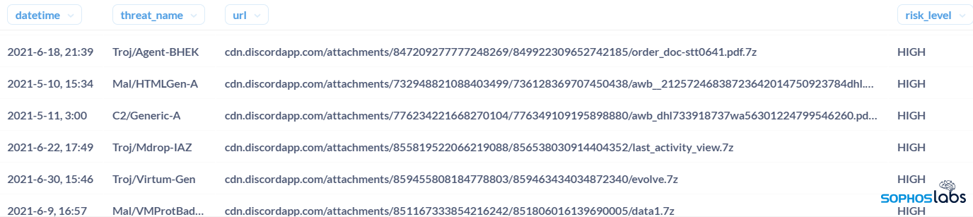 Abuse of Discord, like abuse of any web-based service, is not a new phenomenon, but it is a rapidly growing one: Sophos products detected and blocked, just in the past two months, nearly 140 times the number of detections over the same period in 2020. In April, we reported over 9,500 unique URLs hosting malware on Discord’s CDN to Discord representatives.
