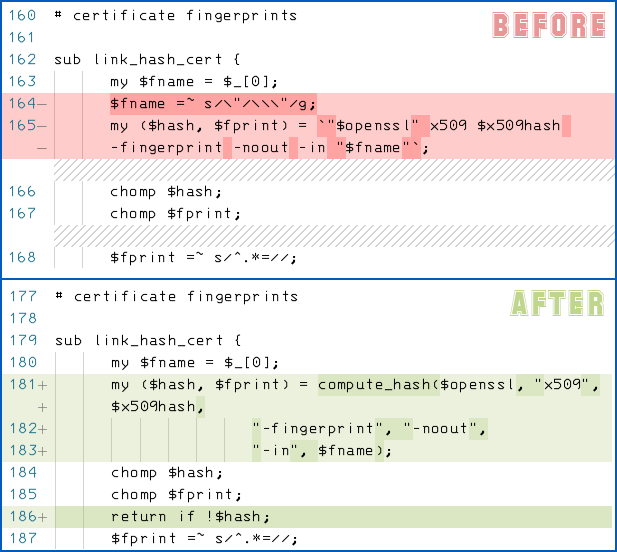 c_rehashutility if you are using it. The all-in-one utilityopenssl, which is commonly used for generating and signing certificates in the first place, now includes a built-in sub-command calledrehashto do the same job. Tryopenssl rehash -helpfor further information. - Sanitise your inputs and outputs. Never assume that input you receive is safe to use as-is, and be cautious with the data you pass on as output to other parts of your code.