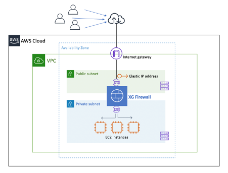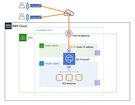 You first need to deploy XG Firewall in your organization’s Virtual Private Cloud (VPC). In the example below, the XG is deployed in a single Availability Zone, with one Elastic Network Interface (ENI) in each of the two subnets, a Public subnet and a Private subnet.