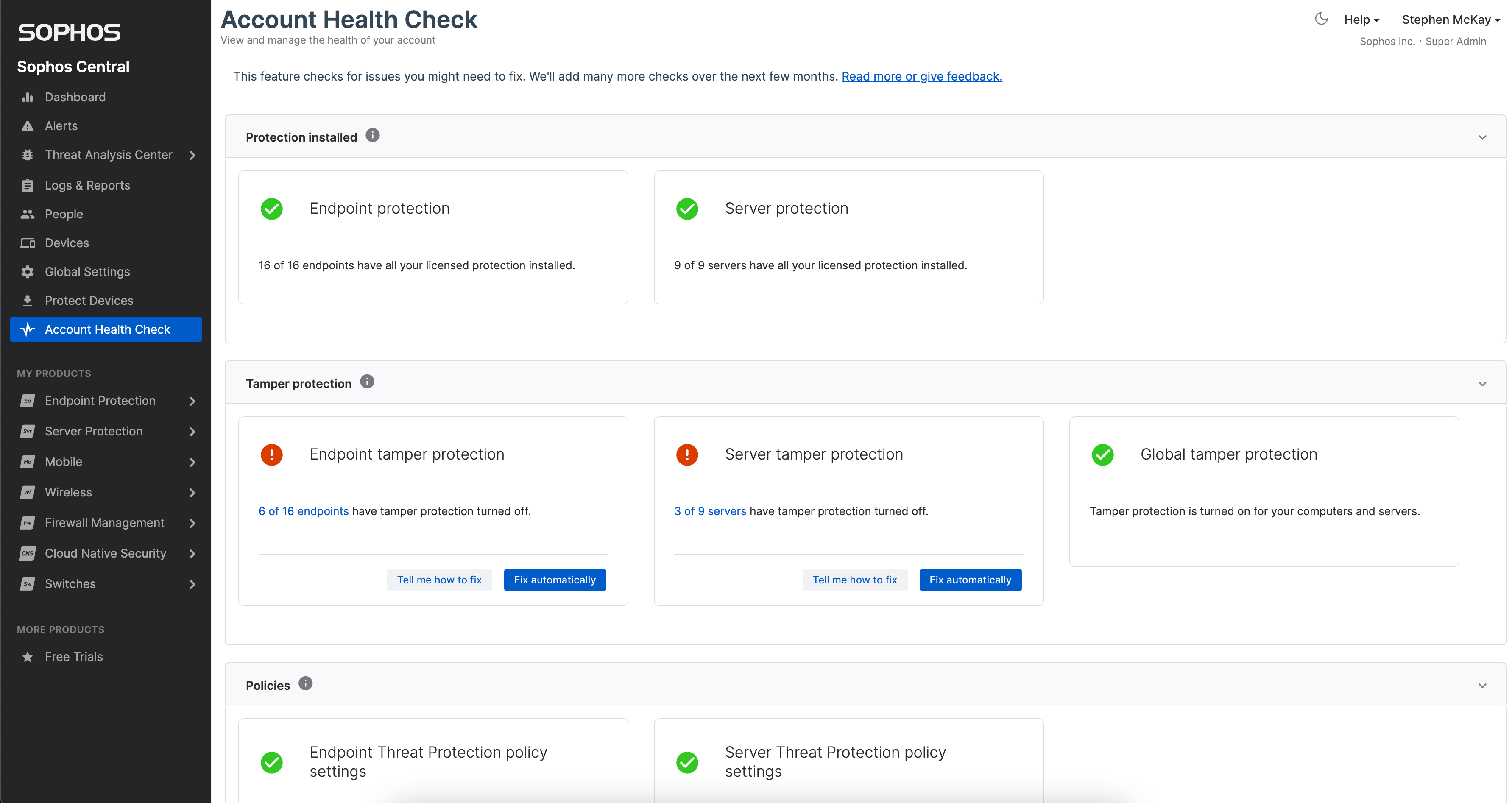 Check Tamper Protection is enabled with the Sophos Account Health Check