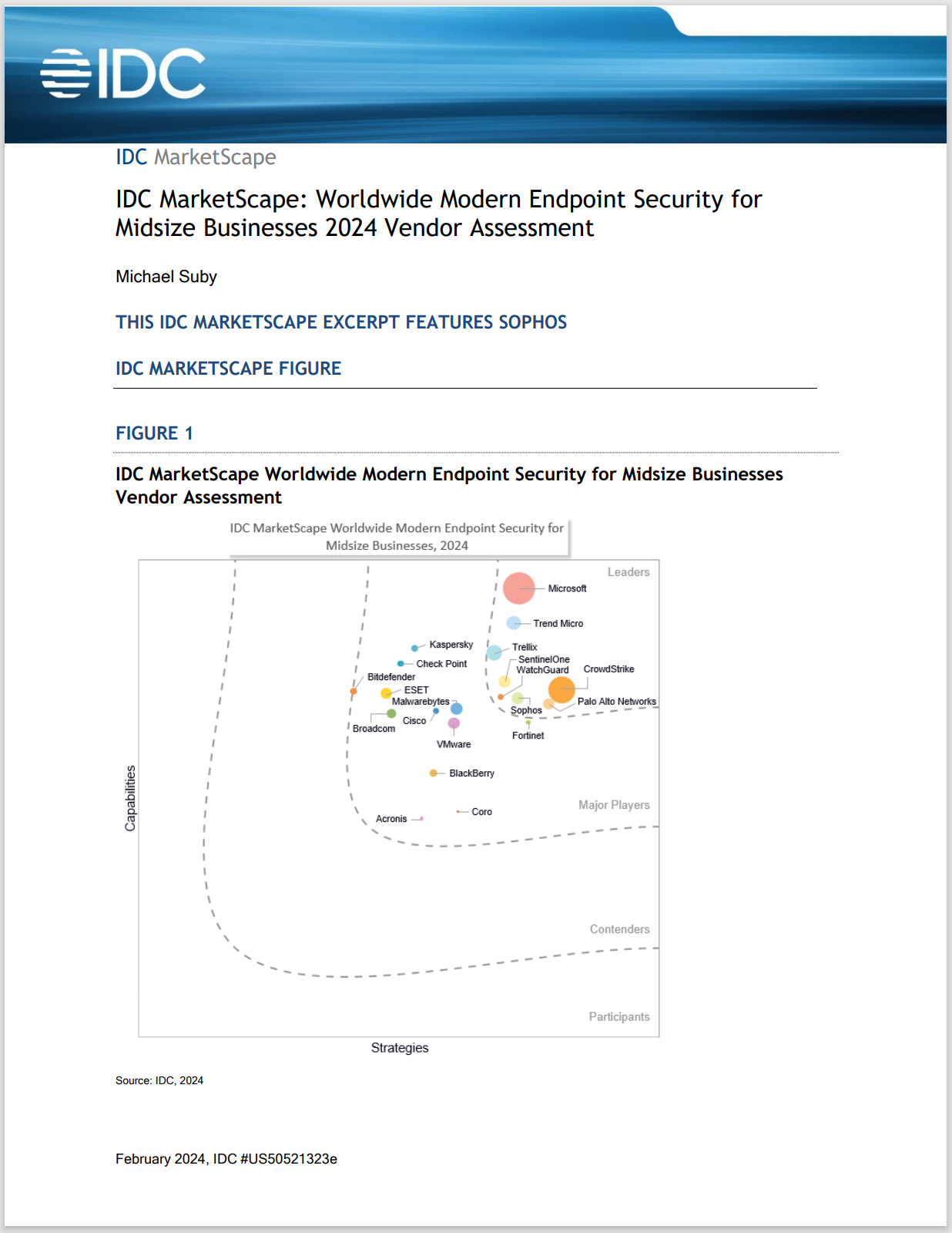 We are delighted to announce that Sophos has been named a Leader in the IDC MarketScape: Worldwide Modern Endpoint Security for Midsize Businesses 2024 Vendor Assessment.