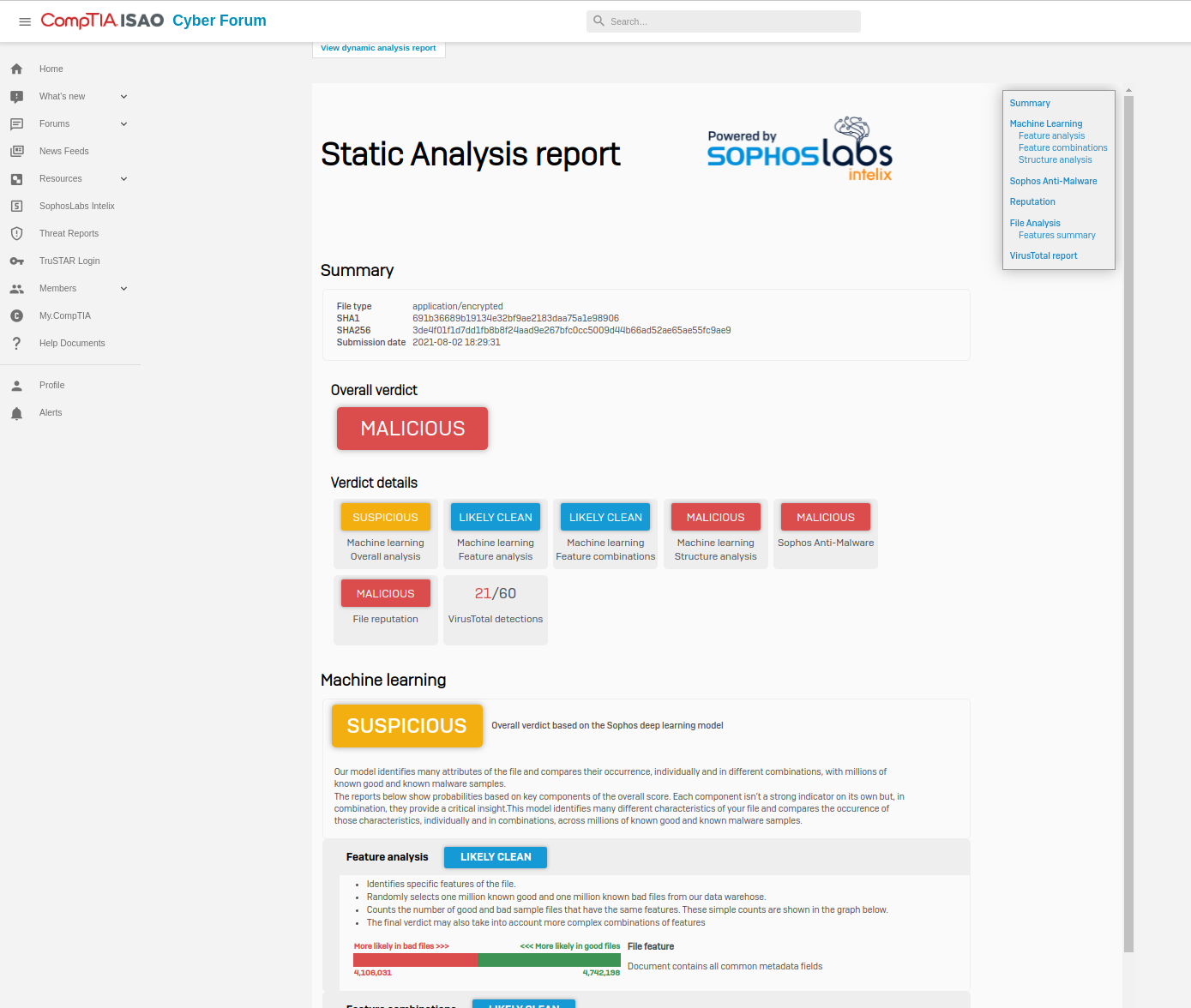 Example static analysis report powered by SophosLabs Intelix and accessed from the CompTIA ISAO Cyber Forum