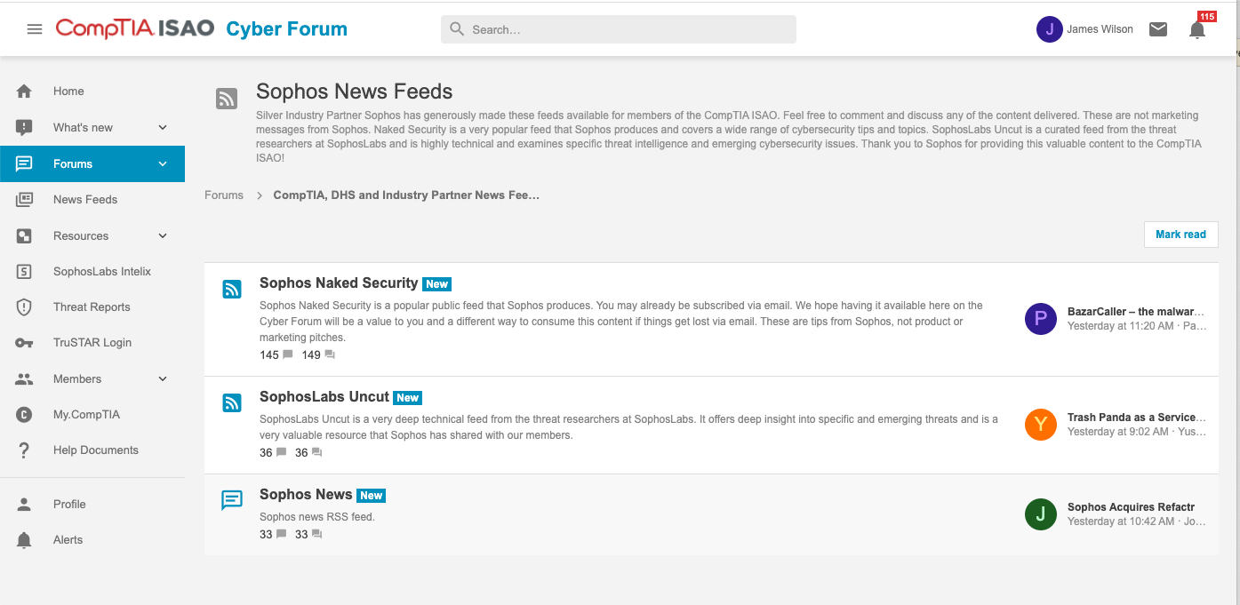 Members can get the latest updates from SophosLabs Uncut, Sophos News Sophos Naked Security directly within the ISAO Cyber Forum