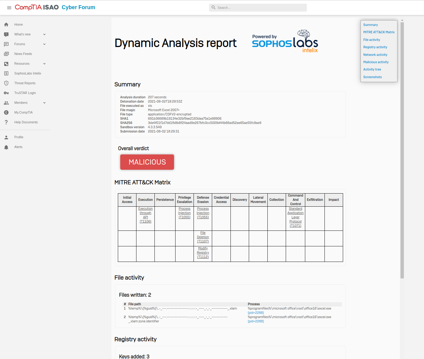 Example dynamic analysis report powered by SophosLabs Intelix and accessed from the CompTIA ISAO Cyber Forum