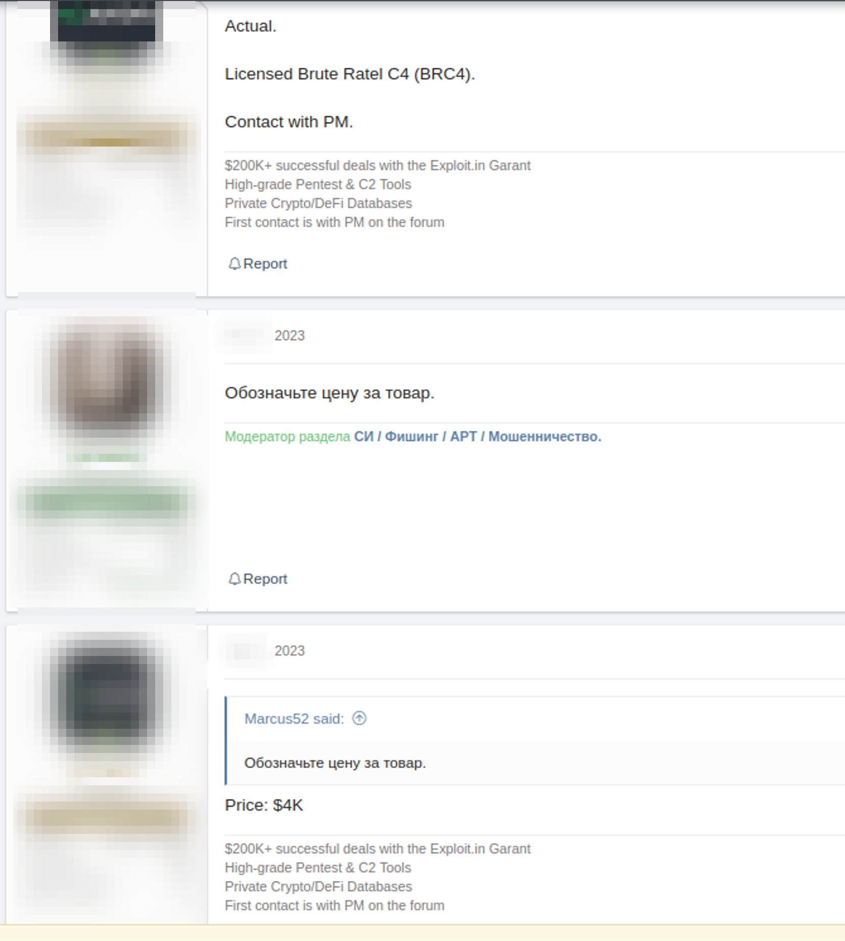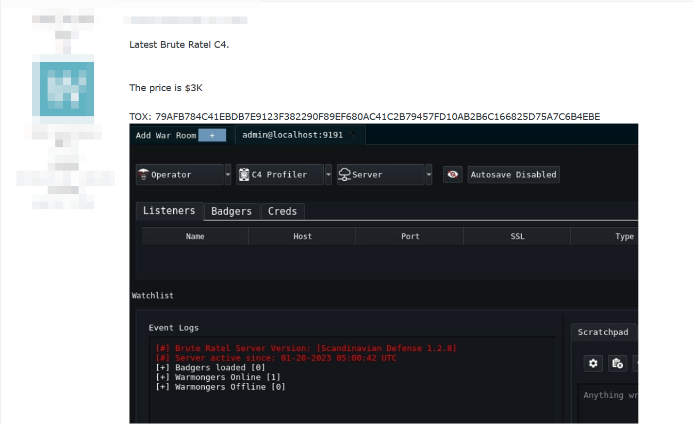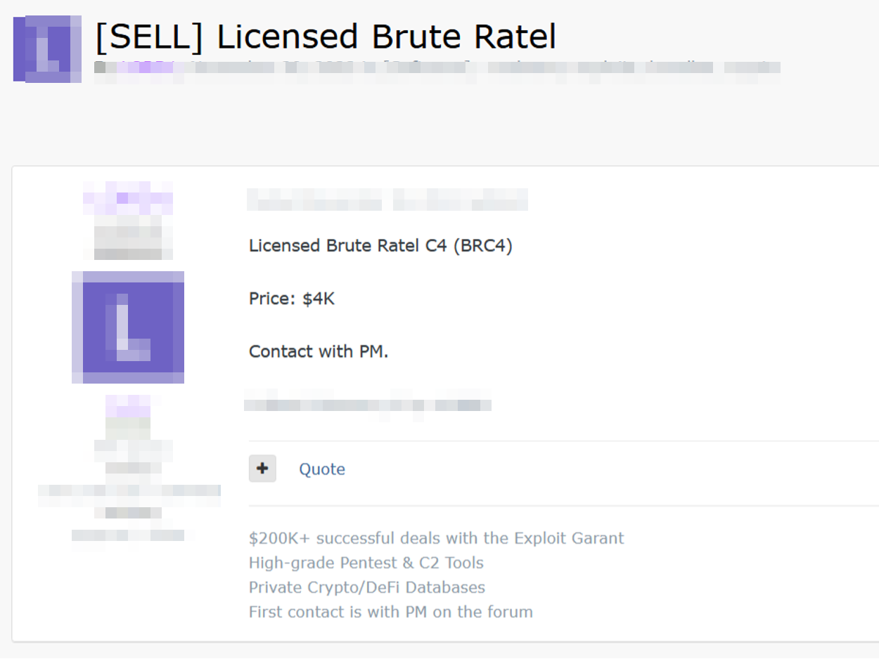 Various versions of Brute Ratel have found their way to criminal marketplaces despite updates by the developer that allegedly prevent license abuse—including some sellers who offer it as a service. Prices range from $4,000 for the full suite of a recent version ($1,000 more than the developer’s price) to $2,250 per year as a service (plus a $500 C2 server set-up fee).