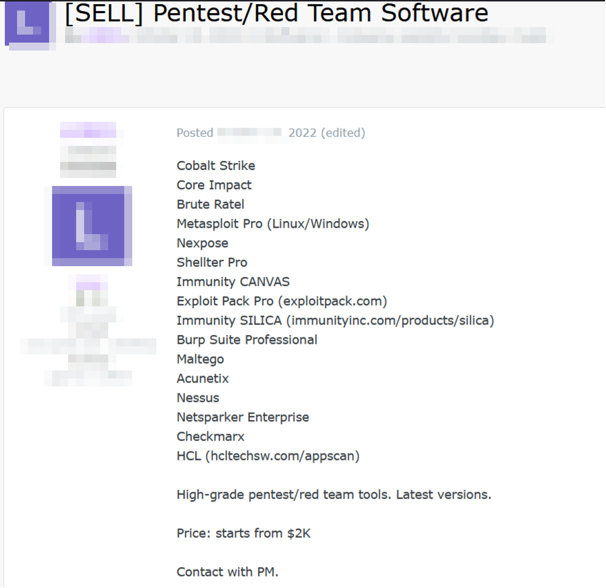 In comparison, there are many leaked versions of Cobalt Strike freely available on both dark web and public sites (though some of the more public postings have been taken down as the result of Digital Millennium Copyright Act takedown requests). Version 4.7’s code has been in the wild since the fall of 2022 through file-sharing sites; later versions are also available for sale for a range of prices, including as-a-service offerings starting at $5,000. But cracked versions of Cobalt Strike’s components are widely available, so only those threat actors with less experience are likely to pay someone for it.