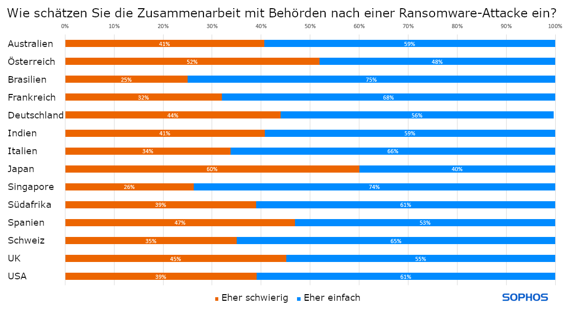 Dem Report nach wandten sich angegriffene Unternehmen auch an Behörden, um Unterstützung und Hilfsmaßnahmen zur Aufarbeitung nach ihrer Ransomware Attacke zu erhalten. 61 Prozent weltweit und 55 Prozent in DACH erhielten Beratung, 60 Prozent weltweit und 52 Prozent in DACH nutzen Hilfe bei der Untersuchung des Angriffs. Aus internationaler Perspektive wurden 58 Prozent derjenigen mit verschlüsselten Daten seitens der Behörden bei der Wiederherstellung ihrer Daten unterstützt. In Deutschland und Österreich war dieser Anteil mit 56 Prozent beziehungsweise. 64 Prozent ähnlich, Lediglich in der Schweiz nutzten nur 45% diese Unterstützung.