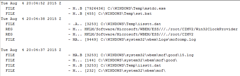 Other information captured in the timeline (e.g., references to \wbem\mof\ and the mofcomp.log file) appears to support this finding. Figure 2 shows relevant log entries from the mofcomp.log file.