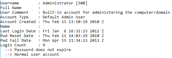 However, this information is misleading, as the script also copies the displayed settings from the Administrator account. Figure 4 illustrates the Administrator account details at the time that the system was analyzed.