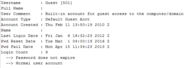Figure 3 illustrates the Guest account details at the time that the system was analyzed. The timestamps are displayed in UTC format. The account's “Pwd Reset Date,” when the password was last set, is approximately 4:00 am UTC, which corresponds to 11:00 pm ET. Although the Guest account is usually disabled by default, Figure 3 shows that this account is enabled and appears to have been used to log into the system nine times.