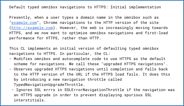 Default typed omnibox navigations to HTTPS: Initial implementation Presently, when a user types a domain name in the omnibox such as "example.com", Chrome navigations to the HTTP version of the site (http://example.com). However, the web is increasingly moving towards HTTPS, and we now want to optimize omnibox navigations and first-load performance for HTTPS, rather than HTTP. This CL [change list] implements an initial version of defaulting typed omnibox navigations to HTTPS. [...]
