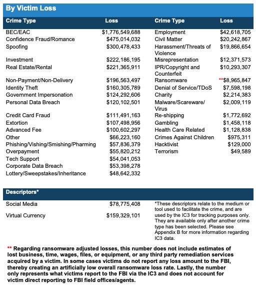 BEC has been a big money-maker for criminals for quite a while, and BEC scammers just keep getting more and more sophisticated at it. This is the second year in a row that the FBI cited increasing skill with these scams, which typically involve legitimate business email accounts that have been compromised, be it through social engineering or computer intrusion, to initiate unauthorized transfers.