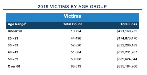 Those of us with gray hair tend to have the most money, and thus we have the dubious honor of being the most targeted and of having the biggest holes torn in our pockets. There were 68,013 people over the age of 60 who reported being victimized last year, and their total reported loss was $835,164,766.