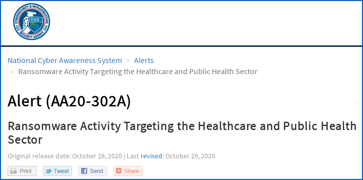 CISA is short for Cybersecurity and Infrastructure Security Agency, and the AA20-302A report was a joint alert from CISA, the FBI and the HHS (US Department of Health and Human Services).
