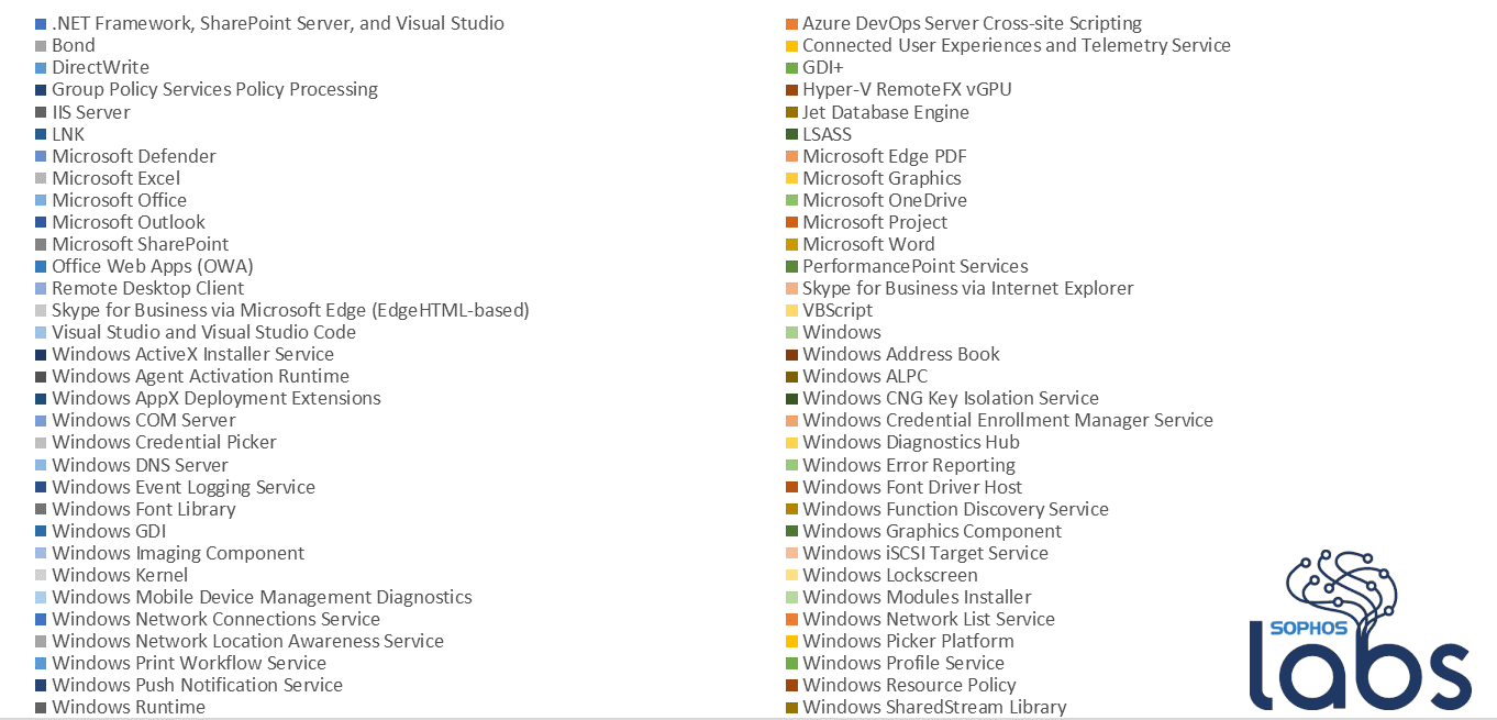 This key represents the products that are reflected in the above chart, which should give an indication as to just how broad the scope of a Patch Tuesday can be. These data points are based on the component names that Microsoft provides to MAPP partners, and they can be confusing about what they address: for example, the table lists “Microsoft Office” in some cases, and specific Office applications in others.
