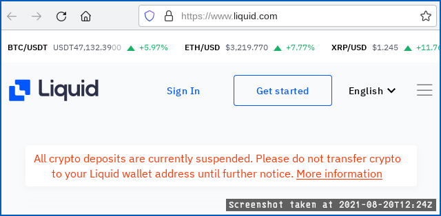 All crypto deposits are currently suspended. Please do not transfer crypto to your Liquid wallet address until further notice.