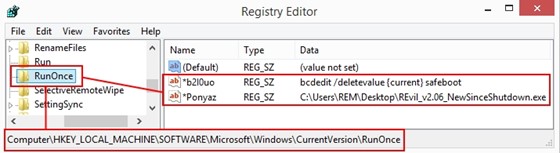 Changes password and registry values for safe mode option: REvil 2.05 introduced a safe mode option. This reboot feature set the current user's password, configured automatic logon, created RunOnce registry values to handle post-reboot operations, and then rebooted the system. In the September 2021 sample, the current user's password was changed from 'DTrump4ever' to 'U1k$NEIq3c6Q'. The RunOnce registry values used for post-reboot operations were changed from '*AstraZeneca' to '*Ponyaz' and from '*MarineLePen' to '*b2I0uo' (see Figure 8).