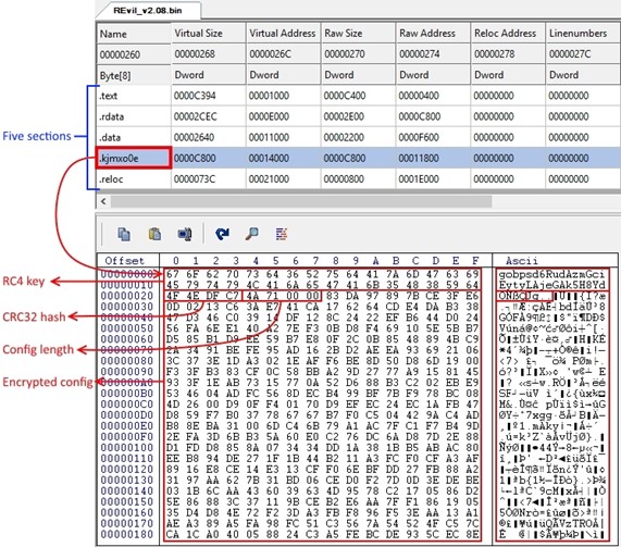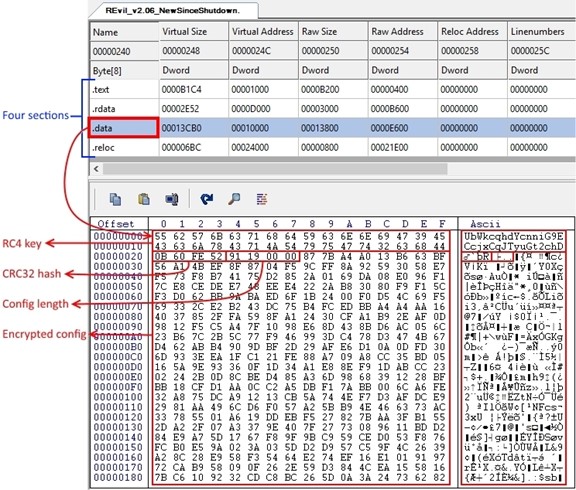 Changes encrypted configuration storage location: Previous REvil binaries contained five sections. The text, rdata, data, and reloc sections were common across all versions. The fifth section was randomly named and contained the RC4-encrypted configuration structure (see Figure 4).