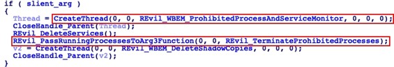 Removes duplicate process termination functionality: Starting with version 1.03, REvil implemented two redundant functions for process termination: a thread that continuously monitored for the creation of new “prohibited” processes, and an initial one-time scan for running processes considered to be prohibited (see Figure 9). Prohibited processes are defined in the 'prc' configuration element and are typically processes that could result in resource conflicts during the encryption process (e.g., sql, firefox, winword). Both functions attempted to terminate detected prohibited processes.