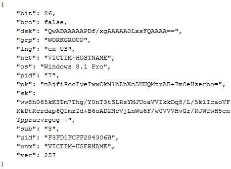 Removes C2 functionality: After REvil successfully encrypts a system, it has an option to communicate basic details to one or more GOLD SOUTHFIELD command and control (C2) servers. If the 'net' configuration element is set to true, REvil sends encrypted data about the infected system, the malware's encryption, and the malware instance. CTU researchers refer to the encrypted data sent to the C2 servers as 'stats'. Figure 10 shows an example of the stats data structure in its unencrypted form.