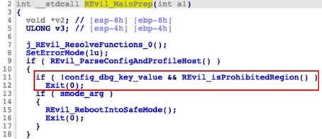 Figure 6. Original code with debug and prohibited region checks. (Source: Secureworks)This validation was removed in the September 2021 sample (see Figure 7) although the dbg configuration element is still present in the configuration.