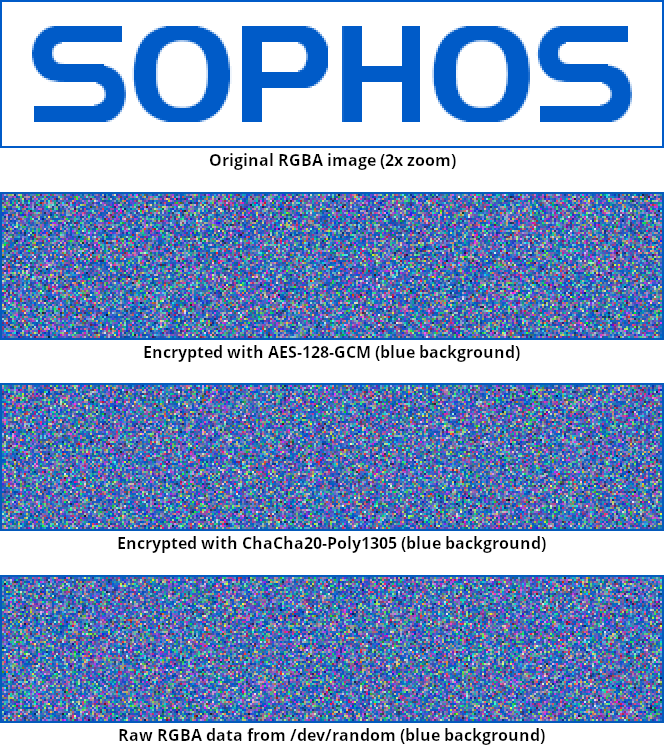 Below, we’ve shown what we got using AES-128-GCM and ChaCha20-Poly1305 (we discarded the MAC codes here), along with an “image” consisting 95,040 RGBA bytes (330×72 at 4 bytes per pixel) from the Linux kernel pseudorandom generator.
