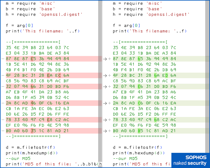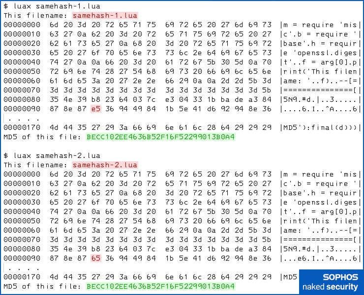 Yet the above pair of two-faced Lua files, which have exactly the same MD5 hash despite quite clearly not being identical, took us a just a few seconds to prepare.