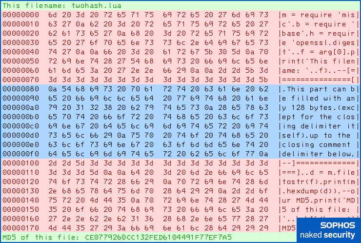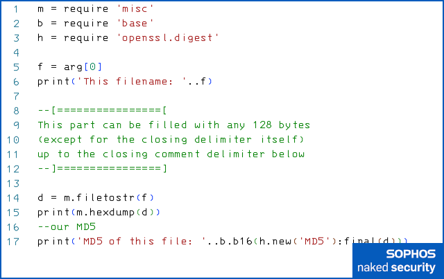 Even if you’re not a programmer, you can probably see that the active code reads in the contents [line 14] of the source code file itself (in Lua, the value arg[0] on line 5 is the name of the script file that you’re currently running), then prints it out as a hex dump [line 15] , followed by its MD5 hash [line 17]: