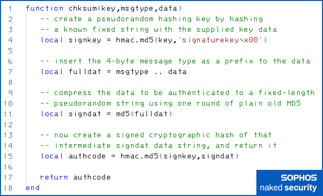 To explain: the authentication code that’s used is calculated by the hmac.md5() function call in line 15, using what’s known as a keyed hash, in this case HMAC-MD5.