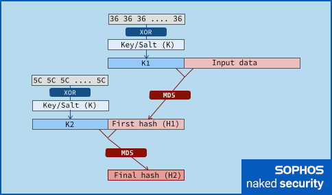 Then, once the first hash is calculated, the key has a different set of bits flipped, gets prepended to that first hash value, and this new input data is hashed a second time.