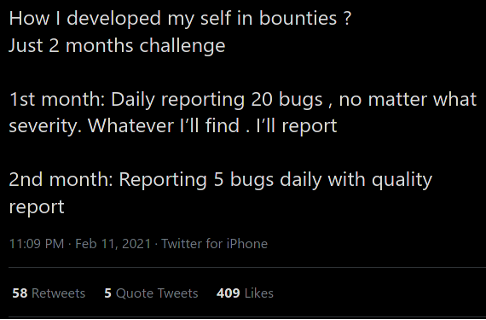 Upon receipt of the gifts, he immediately tweeted to his followers: “Received beautiful swag from @typo3 Instant response ”. Later the same day he also tweeted: “How I developed my self in bounties ? Just 2 months challenge 1st month: Daily reporting 20 bugs , no matter what severity. Whatever I’ll find . I’ll report 2nd month: Reporting 5 bugs daily with quality report”.