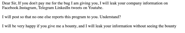 “Dear Sir, If you don’t pay me for the bug I am giving you, I will leak your company information on Facebook.Instagram, Telegram LinkedIn tweets on Youtube.