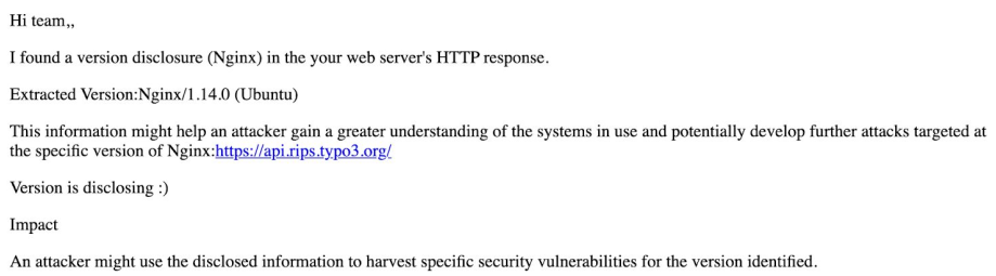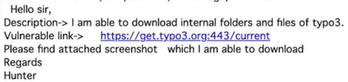 Immediately, a few of the people who had “liked” the tweet submitted bug reports claiming to have found more server version strings on various web servers and internet facing assets. Funnily enough, some people even submitted vulnerability reports pointing out that the source code for TYPO3 was downloadable from their website. Of course the source code is downloadable, it’s an open-source project!
