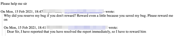 Another tactic we suspect this flurry of reporters used, but cannot prove, is reporting the same issue multiple times, but using different false identities in an attempt to get multiple rewards.