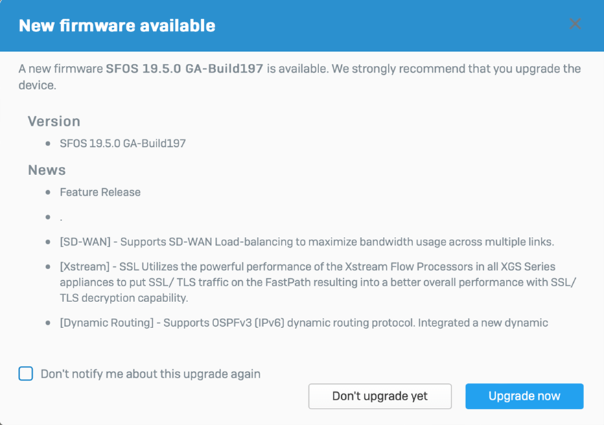 You can also log in and upgrade the firewall locally. Upon logging in, you should see this pop-up appear – simply choose “Upgrade now”…