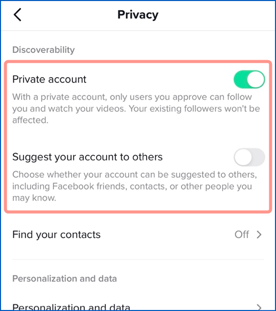 By default, TikTok will share your content by featuring it on the “For you” pages of people you don’t know. If you want to prevent strangers from seeing your videos, you can turn off the Suggest your account to others option, as shown above.