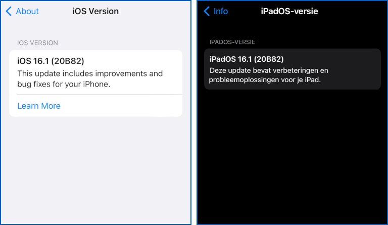 You can compare our own updated iOS phone on the left with the information from an iPad on the right, kindly sent in by a helpful reader (the Dutch text on the right means the same as the English on the left):