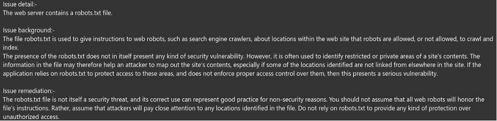One of the more ridiculous submissions I’ve seen came through last week. This person seems to think that having a robots.txt file, to tell search bots what you don’t want indexed on search engines, is a vulnerability. This is really scraping the bottom of the barrel…